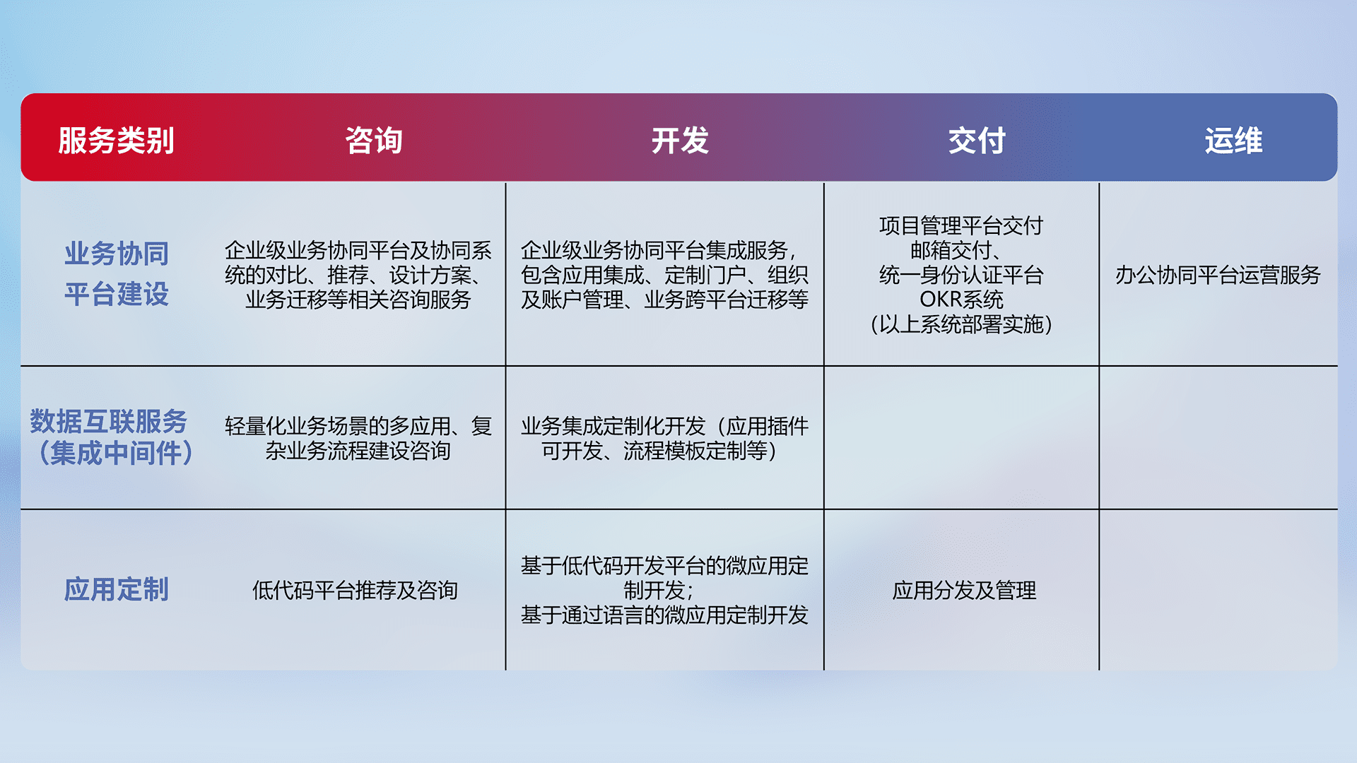 针对钉钉、、、企微、、、、IDaas等平台级产品提供产品的规划、、、、方案、、、、交付、、定制化开发等服务,,,实现如统一协同办公、、智能客户服务、、混合会议管理、、、、智能数据查询、、、、等业务场景,,,,实现数字化转型。。